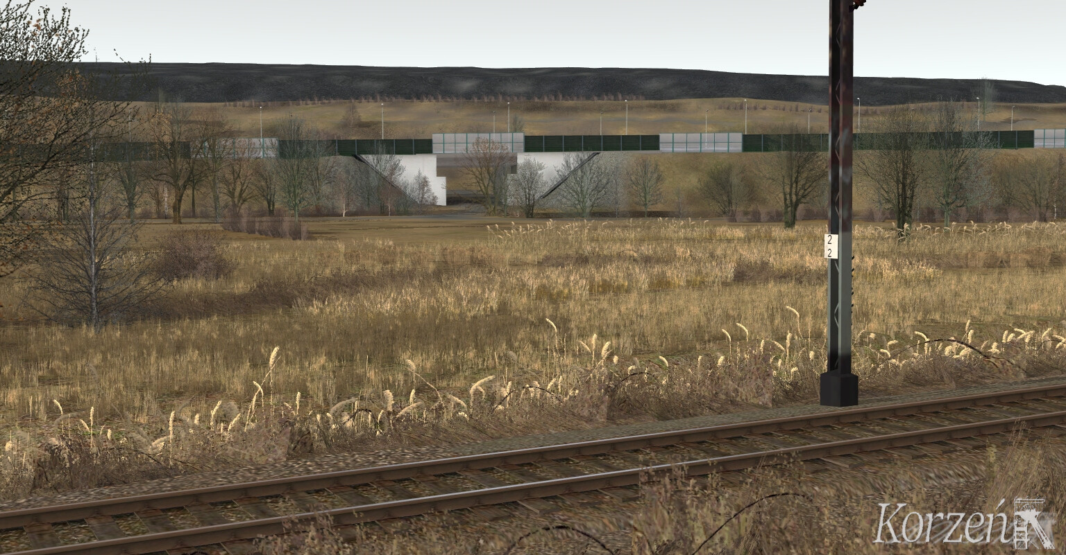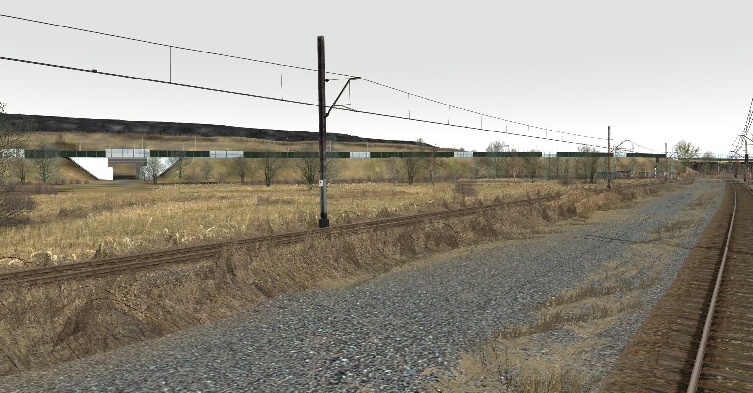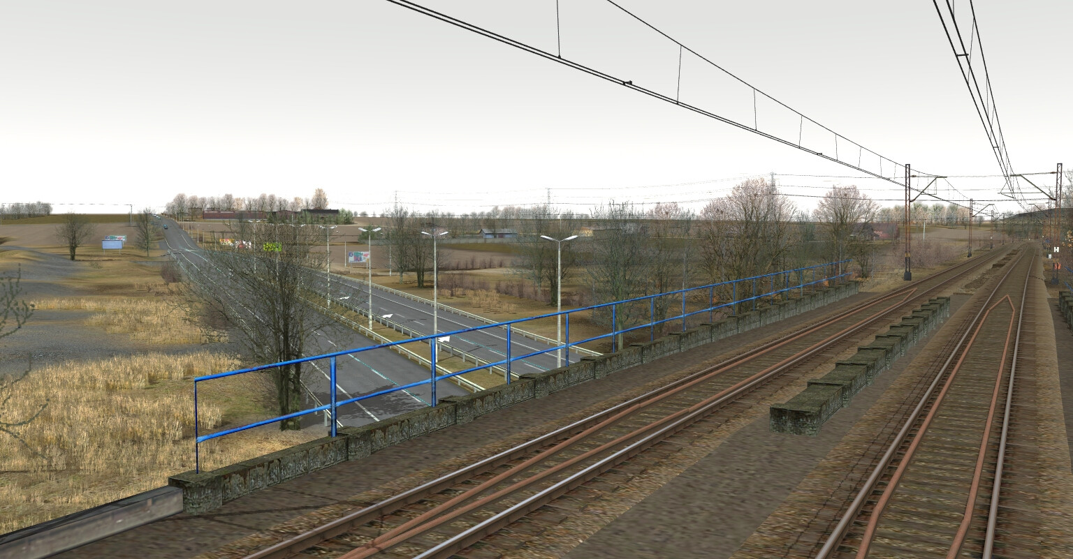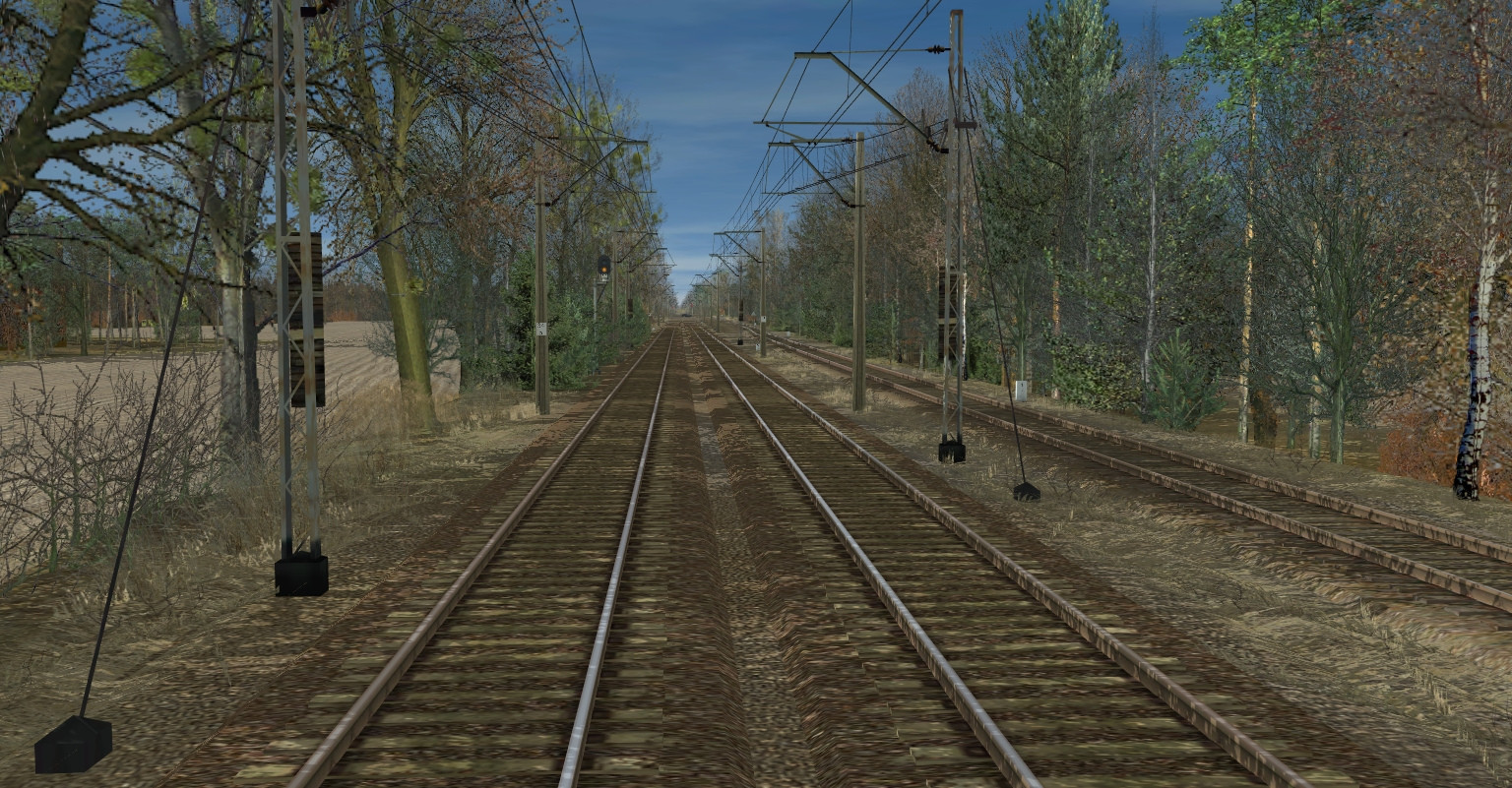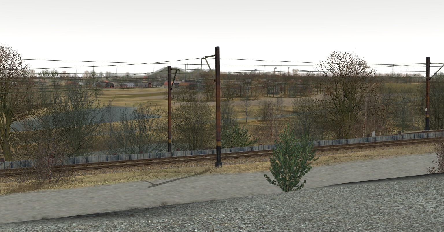 Zająłem się budowaniem dalej i dopiero zajrzałem do tematu Detali w odległości praktycznie nie ma. Są wyższe drzewka, które widać z daleka i w dużo mniejszym zagęszczeniu niż te bliżej toru. No i domki. Staram się wstawiać tylko minimum tego co będzie widać z torów. W czasie jazd jeszcze na pewno coś poucinam gdzie ocenię że jest zbędne. Nie ma dróg, płotów, latarni. Są tylko tekstury gruntu. Ot magia perspektywy. A z otoczeniem muszę "wyjeżdżać" nieco dalej, bo nasyp ma 17m wysokości więc z kabiny widać całkiem sporo.