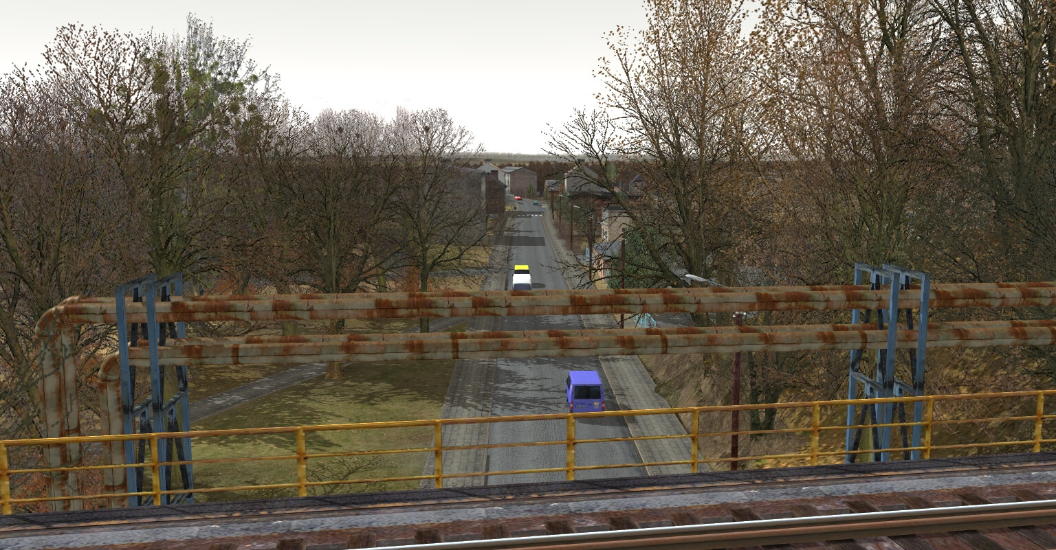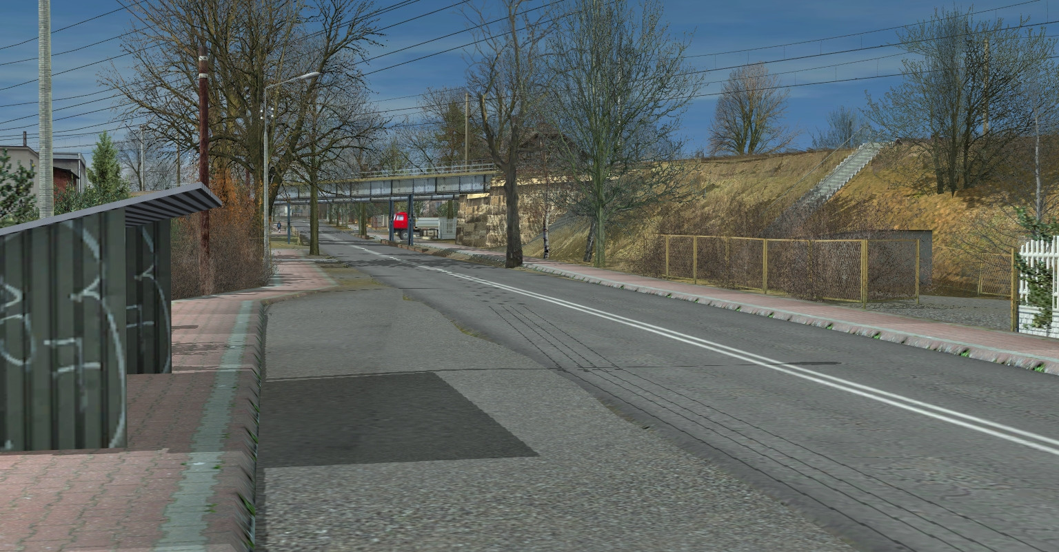 Graffiti nie będę dodawał. Staram się jak najbardziej ograniczać pulę kuidów. Pomijając dedykowane obiekty Jaskrawość wynika z pory dnia kiedy słońce na niego świeci. Popołudniu jest już w porządku. Przy okazji dodałem parę brakujących drzew i kostkę brukową na nasypie: