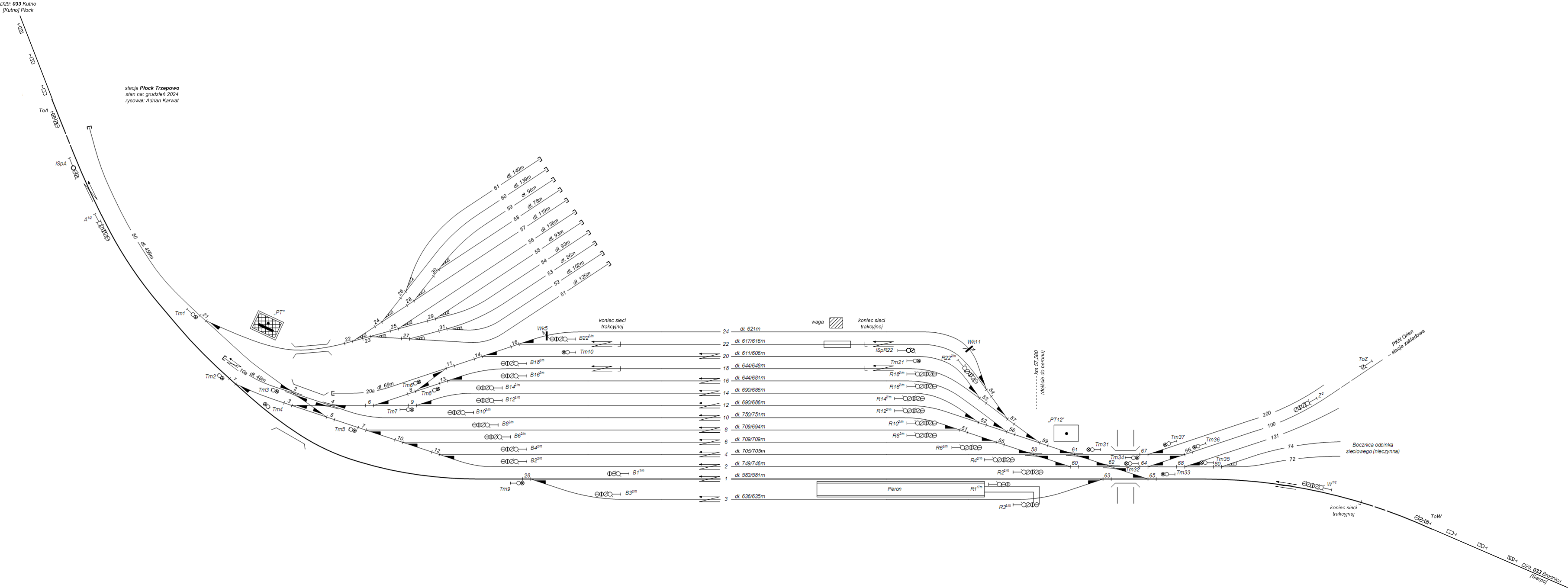 - ten semafor z pasem świetlnym po lewej stronie stoi zdecydowanie zbyt blisko rozjazdu, powinna być zachowana odpowiednia odległość między semaforem a miejscem niebezpiecznym (w tym przypadku rozjazd) który on osłania. Z kolei semafor z pasem świetlnym po prawej stronie mógłby chyba stać nieco dalej, żeby zwiększyć długość użyteczną toru. No i czy rozjazd ma większy promień (czy to 1:12-500?) że pas świetlny jest uzasadniony, użyłeś szablonu?