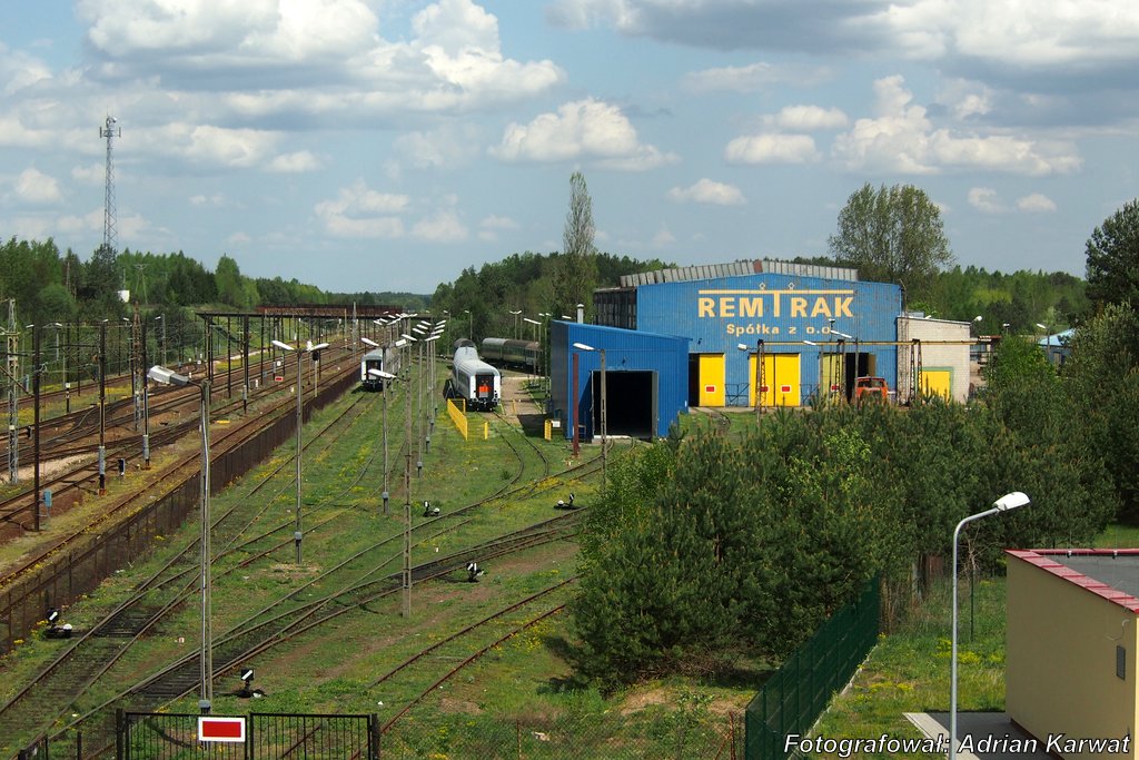 Nieuzasadnione wydaje mi się istnienie tego dodatkowego połączenia bocznicy z torami stacyjnymi (to ten tor z wykolejnicą obok drzewa na dalszym planie), w zupełności wystarczyłby tor odgałęziający się od pozostałych torów bocznicowych, a całość zespołu bocznic po połączeniu w jeden tor może być włączona w tory stacyjne (oczywiście potrzebna wykolejnica i tarcza manewrowa), co już jest (skrajny tor po lewej stronie). Nie jest to wprawdzie błędne, ale ruch manewrowy dla składu węgla z jednym torem i placu ładunkowego z dwoma torami raczej nie jest tak duży aby decydowano się na inwestycję w dodatkowe połączenie umożliwiające objazd.