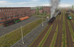 - tutaj też na podstawie screena trudno to ocenić, ale jeśli tory na pierwszym planie to jakaś niewielka zakładowa bocznica, to napędy w rozjazdach powinny być raczej przestawiane ręcznie (przez drużynę manewrową), tarcza manewrowa powinna znajdować się dopiero przy wyjeździe z bocznicy na tory stacyjne (powinna być zamiast widocznego w oddali semafora), a sam wyjazd z bocznicy na tory stacyjne powinien być jakoś zabezpieczony, żeberkiem ochronnym lub wykolejnicą.